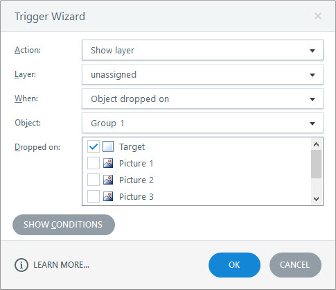 6. This step will feel a little strange…add a drag and drop trigger. It really does not matter what the action is because we are really not triggering anything. We are just creating the ability to drag the document. I typically create a trigger to show a layer, but leave the layer unassigned. The item being dragged should be your document (in my example, it’s a group of three images.)