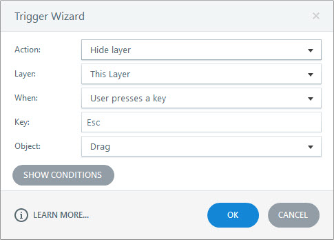 9. Add a new trigger to hide the layer. Since the document was covering the entire screen, we used a trigger to hide the layer when the user presses a key. In the example, we used the Escape key. (If you choose the same, note that this will not work in preview, since Escape is used to exit the preview mode.)