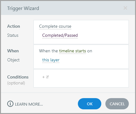 In our example, we want to require that learners complete the interaction before moving on. To do this, we’ll add a Complete course trigger in Storyline, and then adjust the settings of the Continue button in Rise.