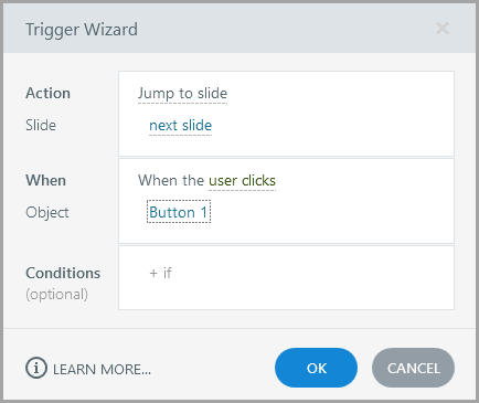 - Finally, add a trigger to that new button that takes the learner straight to your next (original) slide.